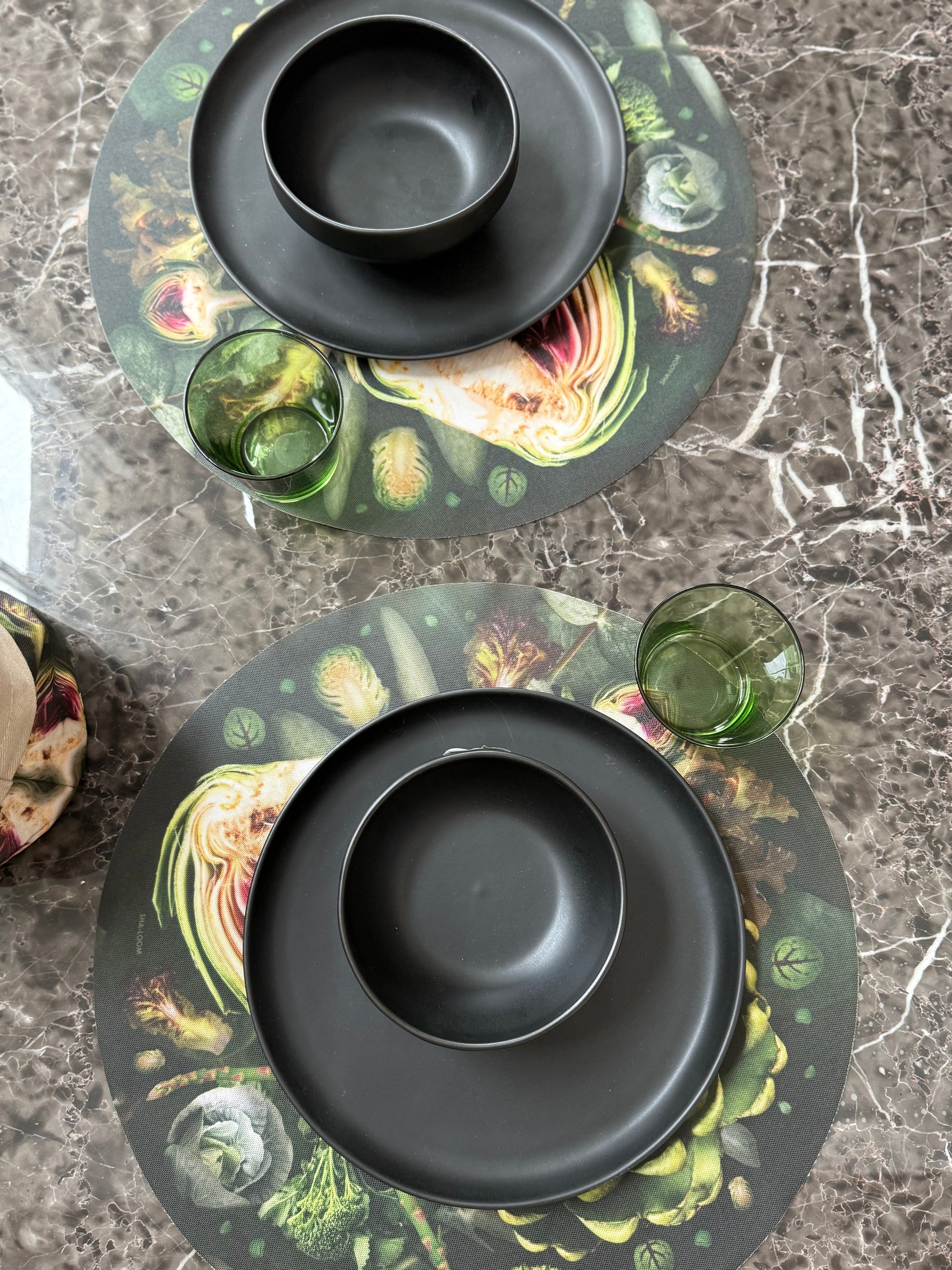 Set the tone for a thoughtful and elevated table with our Artichoke Dreams Placemats. This round design showcases the quiet beauty of the natural world, featuring layers of artichoke hearts, leaves, and greens in a harmonious, kaleidoscopic composition.