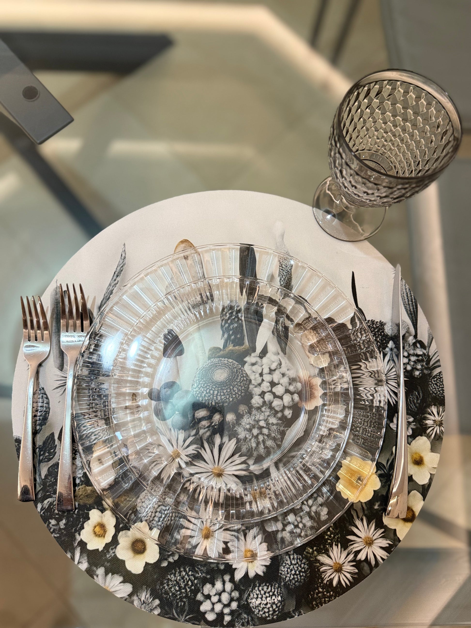 Step into a world of quiet beauty with our Ethereal Forest Placemat. Featuring a dreamy composition of forest elements—mushrooms, blooms, and textured foliage—rendered in soft greys with delicate touches of yellow, this design captures the magic of nature in its most poetic form.
